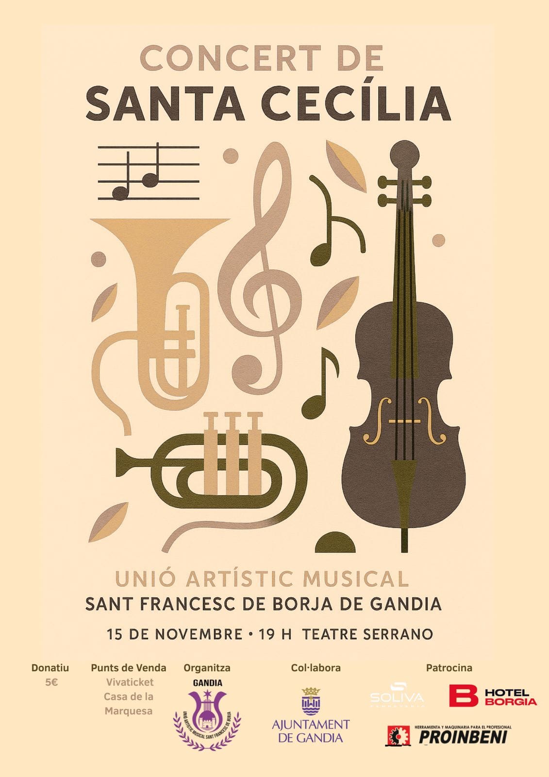 La Unió Artístic Musical Sant Francesc de Borja de Gandia celebrará su tradicional Concert de Santa Cecília el próximo 15 de noviembre a las 19:00 horas en el Teatre Serrano de Gandia.