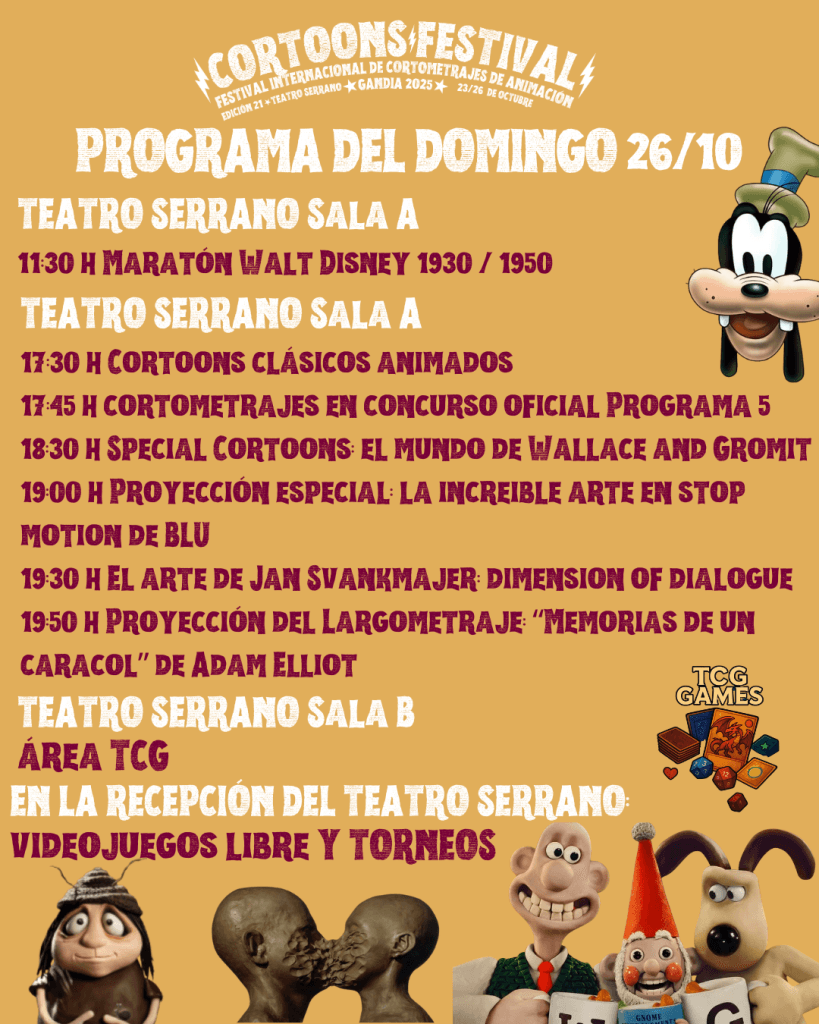 - Retrospectivas dedicadas a creadores y obras señaladas: Jan Svankmajer, Blu, Wallace & Gromit y Walt Disney.